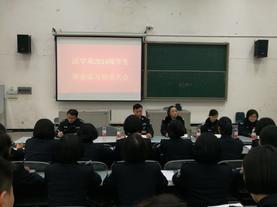 2016年12月15日,法学系2014级司法警务、城市管理与监察、社区管理与服务三个专业的毕业实习动员大会在北校101教室召开。法学系副调研员唐永莉教授、牟将军副主任及相关教研室主任、中队长参加了动员大会。