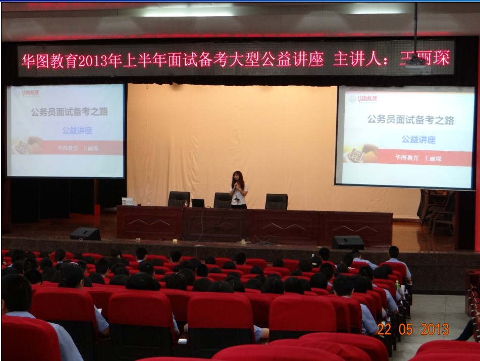 为帮助学子全面、深刻的了解公务员考试,掌握公务员面试技巧,科学备考,法学系于2013年5月22日在北校学术报告厅,举办了“华图教育公务员面试技巧”专题讲座。